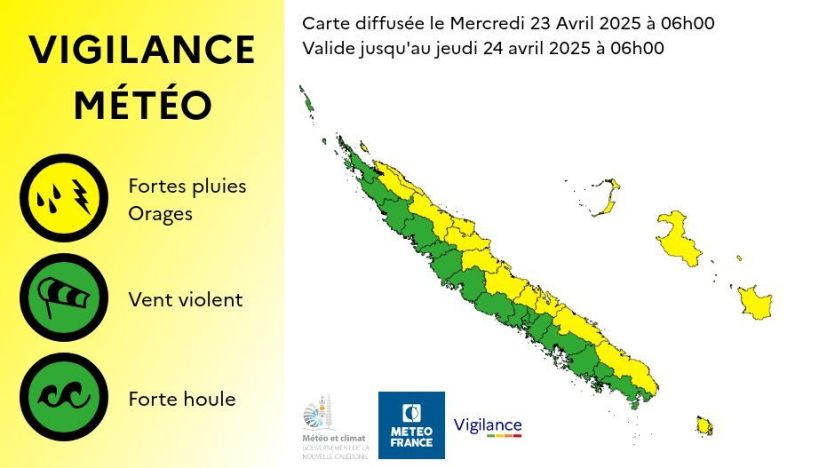 Météo Franc NC place 15 communes en vigilance jaune aux fortes pluies et aux orages, ce mercredi 23 avril. L’ensemble de la côte Est (de Ouégoa-Pouébo à Yaté) ainsi que les Loyauté sont concernées par cette alerte. Par endroits, des cumuls de l’ordre de 100 à 150 mm d’eau en 24 heures sont attendus. Il est à noter que ces fortes pluies devraient ensuite se déplacer vers Kunié cette nuit.