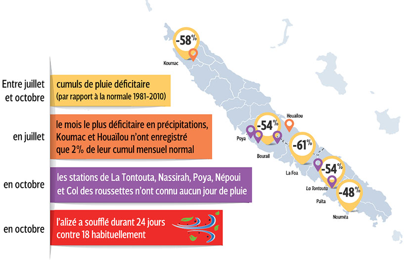 - Gros plan2019 ne connaît pas une période de sécheresse record. Mais, contrairement à 2017, où les pluies étaient revenues dès la fin d’octobre, apportant du répit aux agriculteurs, le manque de précipitations persiste. Le temps sec, chaud et venteux, propice à l’assèchement du sol et au tarissement des cours d’eau n’est pas là pour arranger les choses.En Brousse, l’herbe jaunit et les sols craquelés ont remplacé la végétation verdoyante et les cours d’eau abondants. La Nouvelle-Calédonie vit sa période la plus sèche de l’année. Sans grande surprise, les spécialistes de Météo-France NC ont observé, de juillet à octobre, « unIl vous reste 97% de l'article à découvrir.Cet article est réservé aux abonnés.