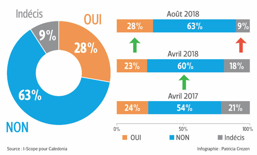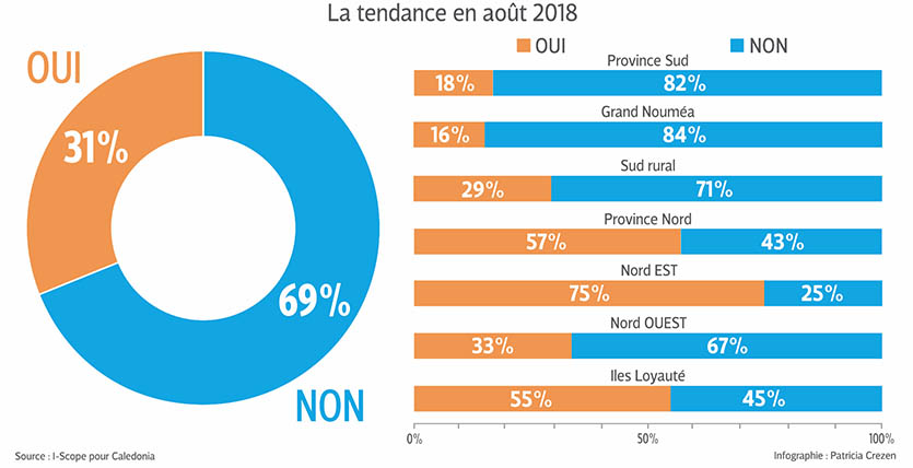- Philippe Frédière | Crée le 06.09.2018 à 06h03 | Mis à jour le 06.09.2018 à 07h49ImprimerUn sondage commandé par la chaîne Caledonia à l’institut I-Scope sur les intentions de vote au référendum du 4 novembre place le « non » à l’indépendance à près de 70 % des suffrages.