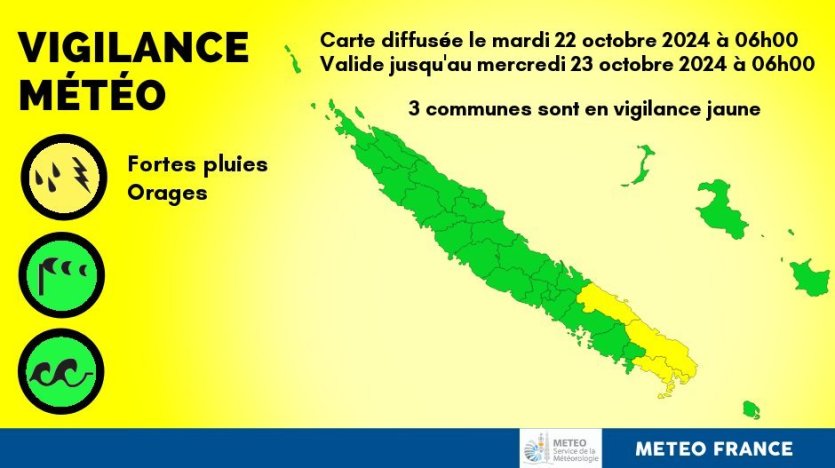 - A.T. | Crée le 22.10.2024 à 07h32 | Mis à jour le 22.10.2024 à 07h33ImprimerSource Météo France NCLes communes de Thio, Yaté et du Mont-Dore sont placées en vigilance jaune la nuit prochaine pour des averses fortes et orageuses. Une humidité qui devrait se maintenir dans plusieurs régions du pays, ce mercredi.
