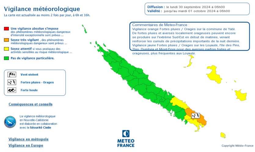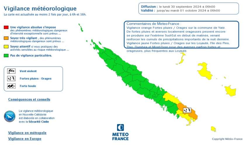 - Baptiste Gouret | Crée le 30.09.2024 à 07h39 | Mis à jour le 30.09.2024 à 07h39ImprimerPlusieurs communes du sud du pays, ainsi que l’île des Pins et les Loyauté, sont toujours concernées par l’épisode orageux qui a touché la Nouvelle-Calédonie dimanche soir. Carte Météo FranceAprès les fortes précipitations de cette nuit, l’extrême sud du pays est toujours concerné par un épisode orageux ce lundi. Les averses atteindront les Loyauté et l’île des Pins dans la journée.
