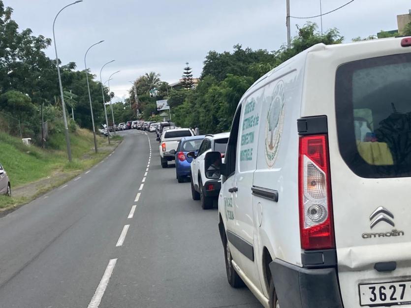 Au 7e Km, les voitures avancent tout doucement. "On a fait 500 mètres en une demi-heure", déclare un automobiliste. Photo Baptiste Gouret[11h10] Les opérations de déblayage se poursuivent. A l’image de ce convoi qui traverse ce matin l’avenue Becquerel, à Dumbéa.