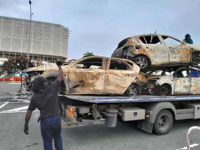[16H35] Les opérations de déblayage se poursuivent. Ce mardi, en fin d’après-midi, les carcasses des véhicules brûlés sur le parking de l’ancien CHT, au centre-ville, ont été évacuées.