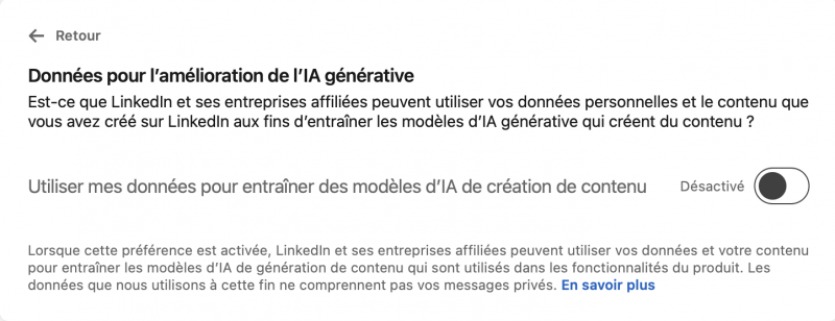 Si l'utilisateur ne souhaite pas que ses données soient utilisées, il doit désactiver la case "Utiliser mes données pour entraîner des modèles d'IA de création de contenu". Capture d'écran Radio 1 TahitiDans le cas contraire, les données du profil – nom, photo, localisation, emplois et formations, recommandations, ainsi que les messages postés, les réponses aux publications de tiers, et une partie des échanges éventuels avec des recruteurs et les questions posées à l'IA dans l'application – sont susceptibles de servir de base à l'IA de LinkedIn. Les messages privés en sont exclus.