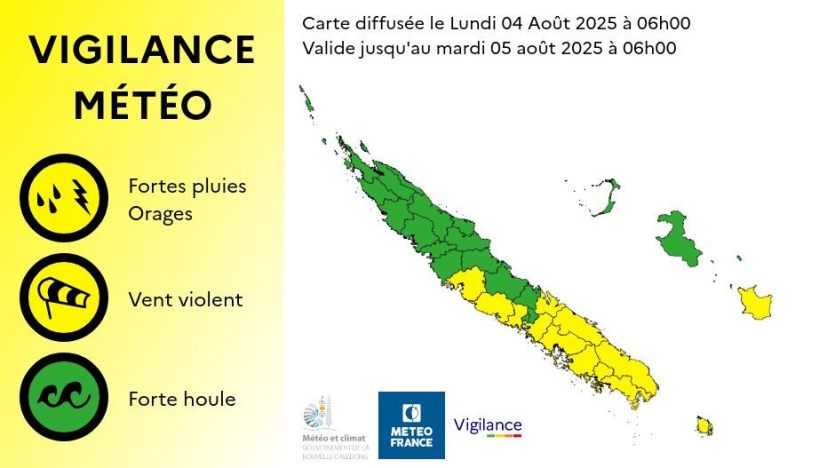 - Baptiste Gouret | Crée le 04.08.2025 à 08h34 | Mis à jour le 04.08.2025 à 08h34ImprimerQuatorze communes ont été placées en vigilance jaune aux vents violents et fortes pluies, ce lundi 4 août. Carte Météo France NCUn vent de 20 à 25 nœuds avec des rafales pouvant atteindre 40 nœuds, devrait toucher la côte Ouest de la Nouvelle-Calédonie, à partir de cet après-midi. La partie sud de la côte Est sera, elle, concernée par des orages et des fortes pluies.