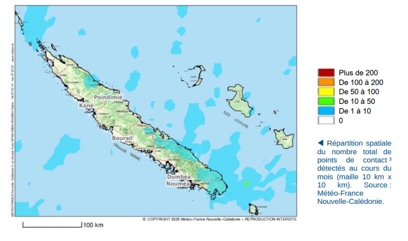 L’ensoleillement a été contrasté selon les régions. Les cartes de rayonnement solaire montrent des cumuls élevés à Nouméa, tandis que les valeurs les plus faibles sont observées sur les reliefs, notamment sur l’Aoupinié. Enfin, l’activité orageuse est restée modérée : 14 jours d’orage ont été recensés, avec 657 éclairs nuage-sol détectés, plaçant janvier 2026 parmi les mois de janvier les moins foudroyés depuis 2014.