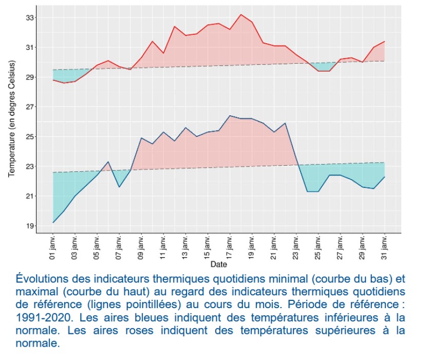 Le bulletin publié le 12 février par Météo-France montre une évolution au fil des jours. Après un début de mois relativement frais, une période de fortes chaleurs s’est installée à partir de la mi-janvier, en particulier sur la côte Ouest. Les températures maximales quotidiennes ont atteint ou dépassé 30 °C durant 22 journées, avec des écarts positifs supérieurs à +2 °C sur plusieurs jours consécutifs.