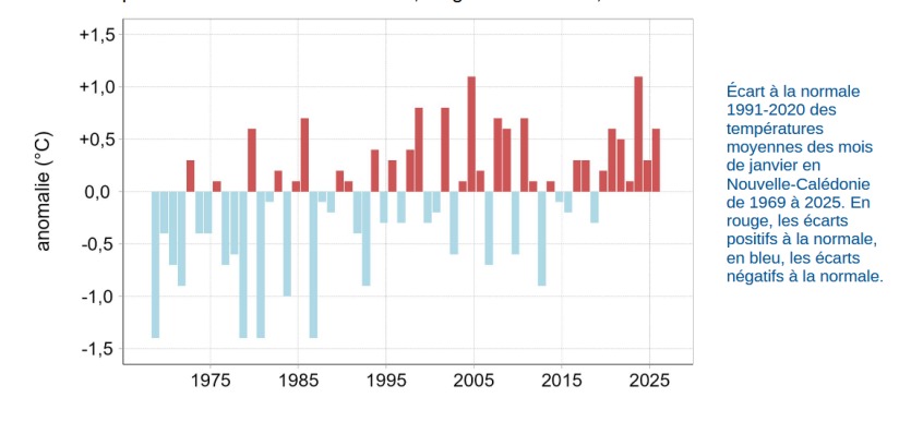 Le mois de janvier 2026 figure parmi les plus chauds observés en Nouvelle-Calédonie depuis plus de cinquante ans. À l’échelle du pays, la température moyenne mensuelle s’est établie à 26,9 °C, soit +0,6 °C par rapport à la normale 1991-2020, plaçant ce mois au 8ᵉ rang des mois de janvier les plus chauds depuis 1969, à égalité avec 1980, 2009 et 2021.