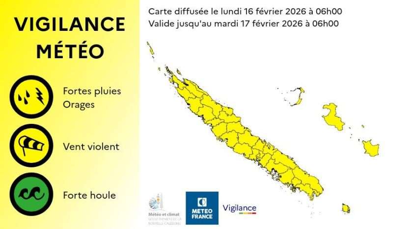 - Baptiste Gouret | Crée le 16.02.2026 à 08h10 | Mis à jour le 16.02.2026 à 08h10ImprimerLes 33 communes de Nouvelle-Calédonie ont été placées en vigilance jaune aux fortes pluies et aux orages. Photo Baptiste GouretDes averses parfois fortes et orageuses sont attendues, ce lundi 16 février, sur une large partie du territoire. Un minimum dépressionnaire devrait également s’installer en Nouvelle-Calédonie d’ici la fin de la semaine.