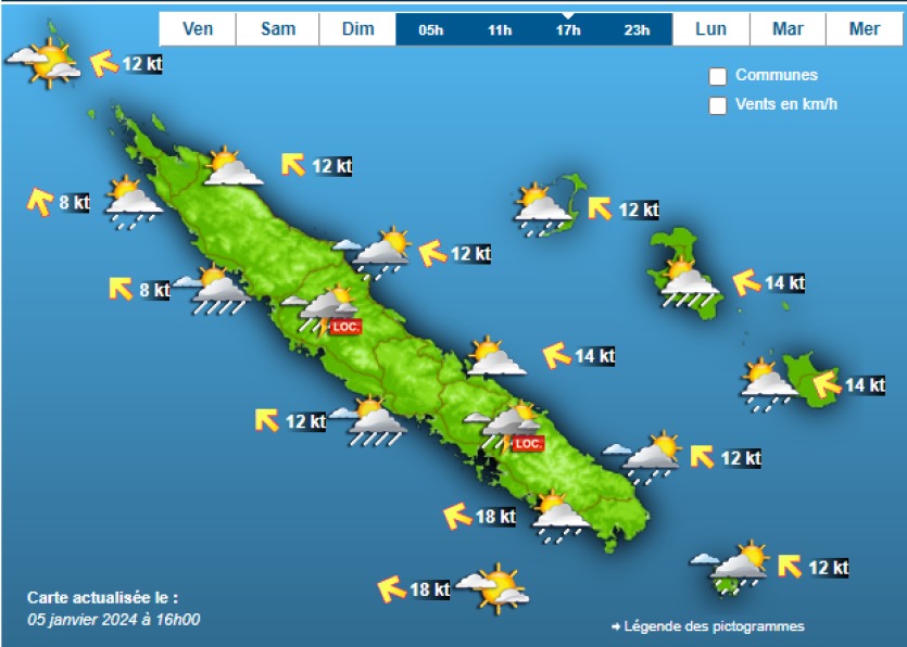 - Baptiste Gouret | Crée le 05.01.2024 à 18h01 | Mis à jour le 05.01.2024 à 18h03ImprimerMétéo France prévoit des précipitations un peu partout en Nouvelle-Calédonie ce week-end. Capture Météo FranceDans son bulletin du week-end, Météo France prévoit des précipitations samedi et dimanche, après des semaines d’un temps chaud et sec.