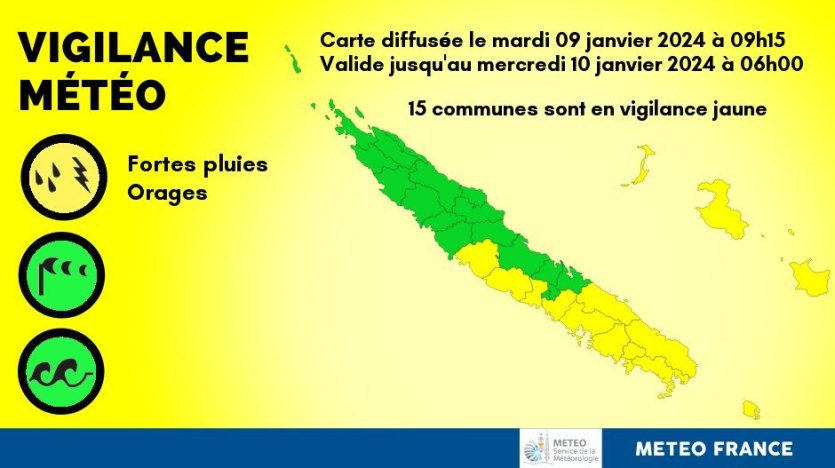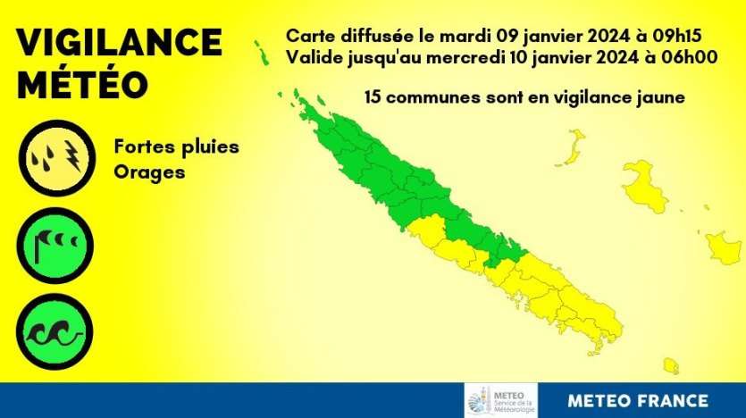 [Mise à jour : 9h30] Météo France NC vient finalement d'étendre sa vigilance jaune aux orages et aux fortes pluies à quinze communes du pays, de Poya au Mont-Dore, sur la côte Ouest, de Yaté à Thio sur la côte Est ainsi que sur Kunié et les Loyauté pour ce mardi après-midi.