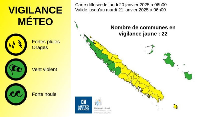 - A.T. | Crée le 20.01.2025 à 08h24 | Mis à jour le 20.01.2025 à 08h25ImprimerSource Météo FranceLa côte Est et la moitié sud de la façade Ouest jusqu’à l’île des Pins restent placées sous vigilance jaune aux orages et fortes pluies ce lundi 20 janvier.