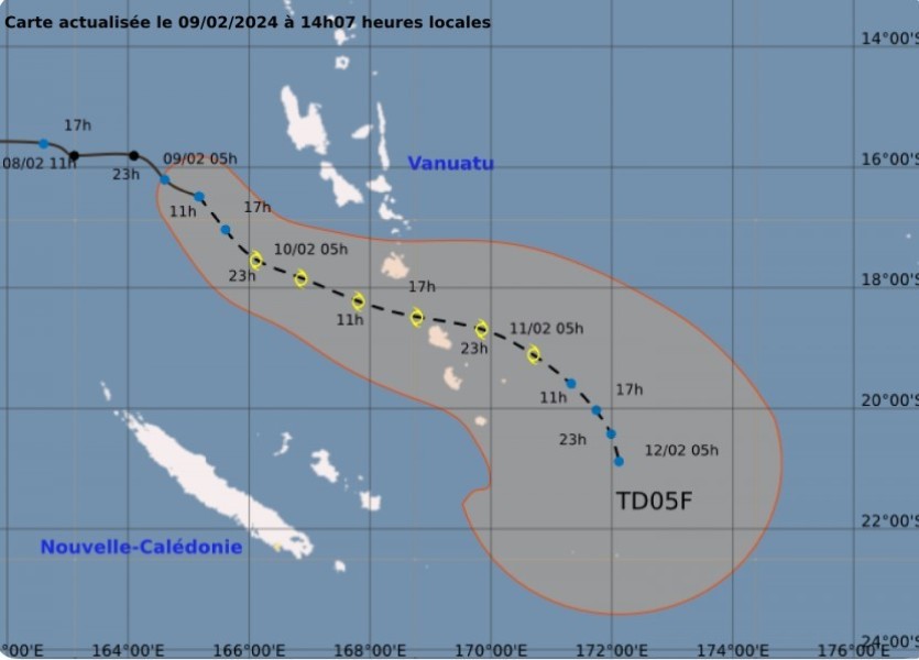- Anthony Tejero | Crée le 09.02.2024 à 17h28 | Mis à jour le 10.02.2024 à 10h11ImprimerSource Météo FranceLa dépression tropicale actuellement au nord de la Nouvelle-Calédonie devrait toucher la région d’Efaté, au Vanuatu, ce samedi. Si le Caillou pourrait être globalement épargné par ce phénomène, un renforcement des vents et des pluies est à prévoir pour ce week-end, en particulier sur les Loyauté et la côte Est. Des conditions météo qui devraient se dégrader également dans le Sud du pays, à l’approche de la rentrée.