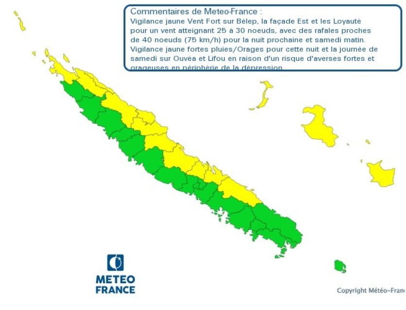 Si elle reste éloignée de la Nouvelle-Calédonie, la dépression génère temporairement un renforcement des vents d’est à sud-est aux Loyauté ainsi que sur la pointe nord et l’est de la Grande Terre. Dans le courant de la nuit et jusqu’au samedi matin, les vents pourront souffler avec des rafales jusqu’à 75 km/h.