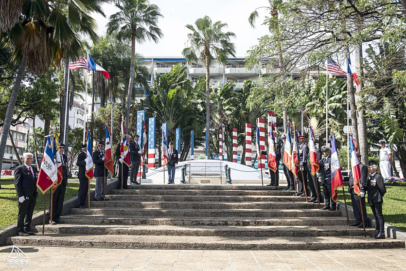 Denise Campbell Bauer a débuté sa visite en Nouvelle-Calédonie par un dépôt de gerbes au monument américain, place de la Moselle. Photo Province SudMERCI DE VOUS IDENTIFIER