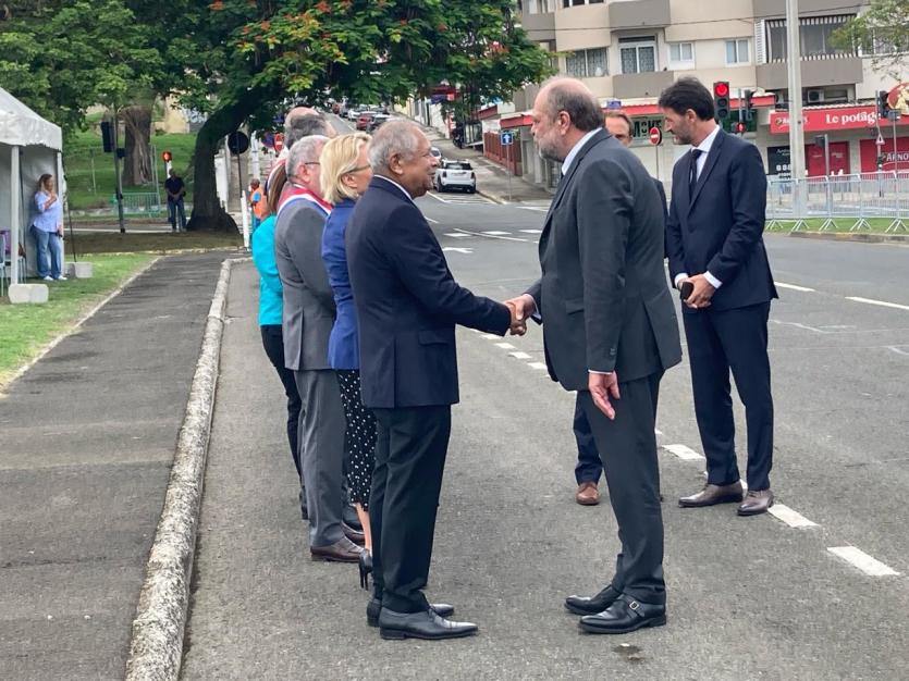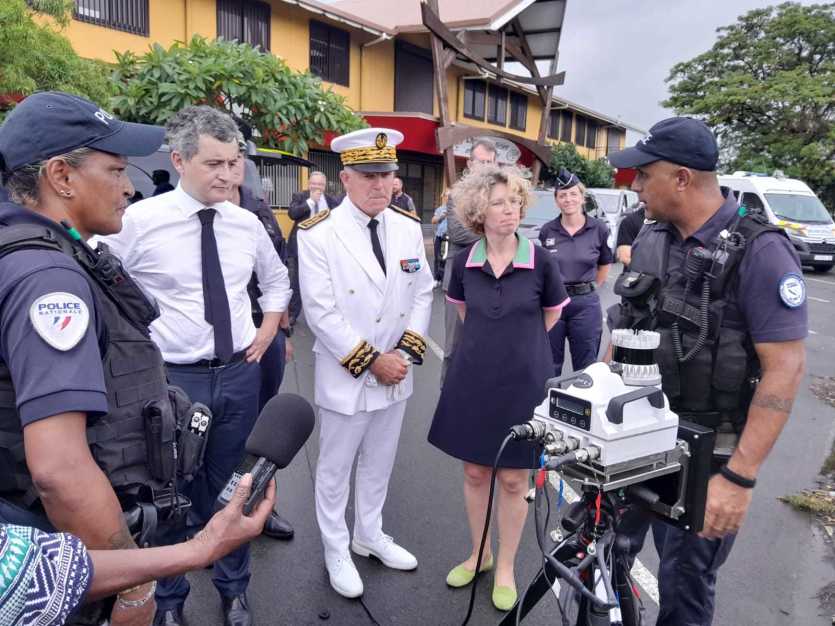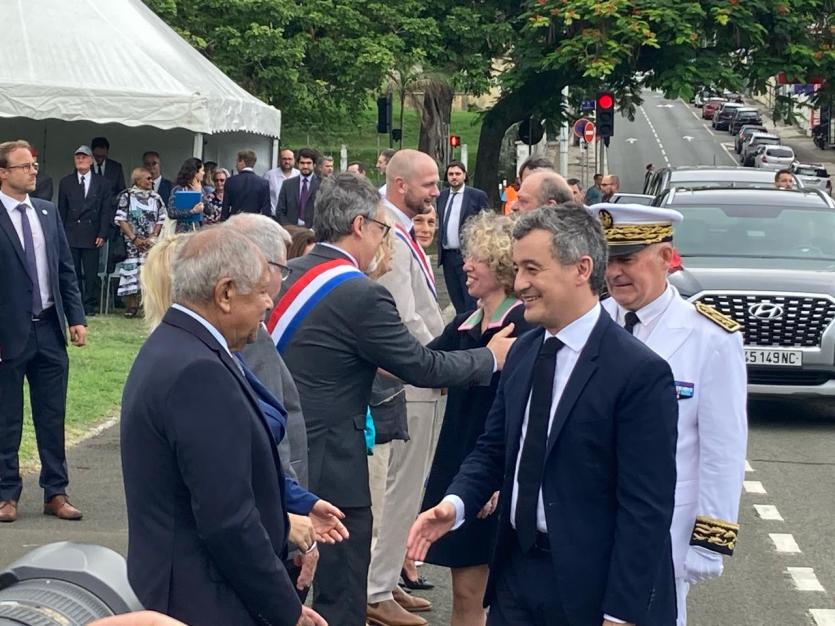 Arrivée du ministre de l’Intérieur et des Outre-mer, Gérald Darmanin, et de la ministre déléguée aux Outre-mer, Marie Guévenoux, ce mercredi matin place Bir-Hakeim, en compagnie du haut-commissaire Louis Le Franc. Photo Baptiste Gouret