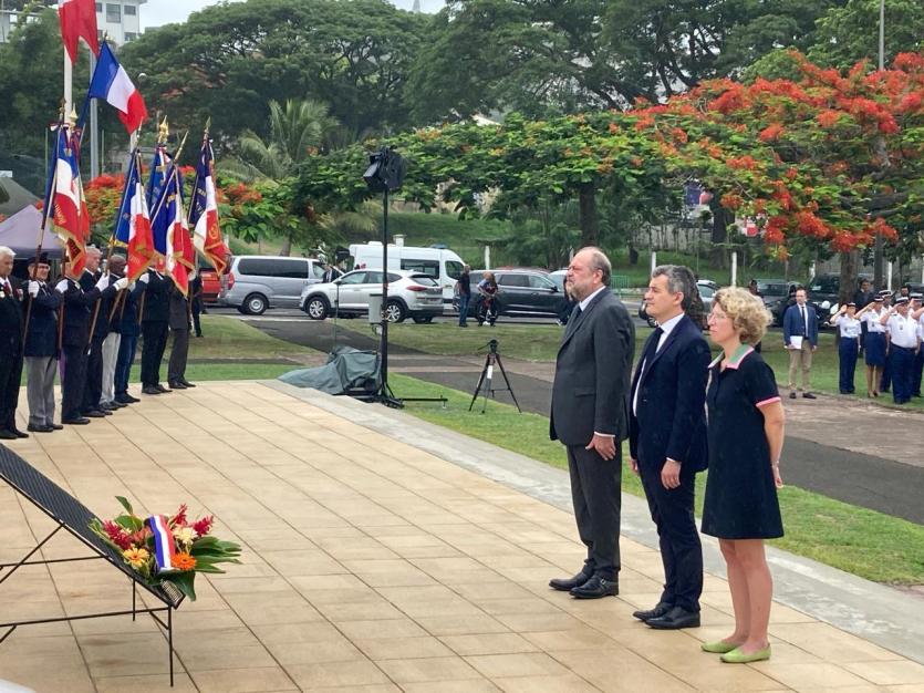 [8 heures] La cérémonie au monument aux morts, sur la place Bir-Hakeim, se prépare en attendant l’arrivée des trois ministres. C’est la première séquence de la journée, passage incontournable d’une visite ministérielle sur le Caillou. Eric Dupond-Moretti vient d’arriver.