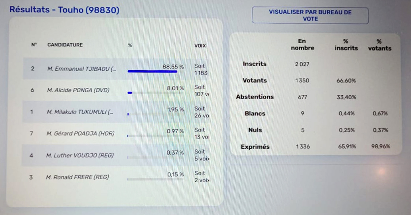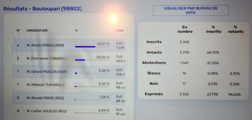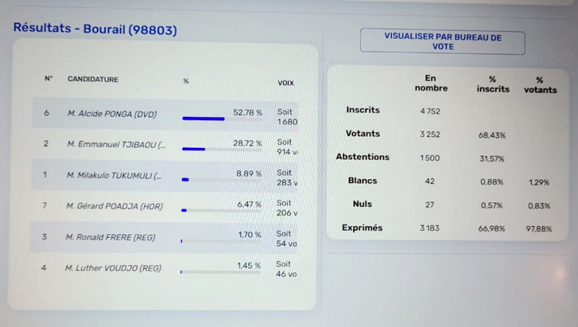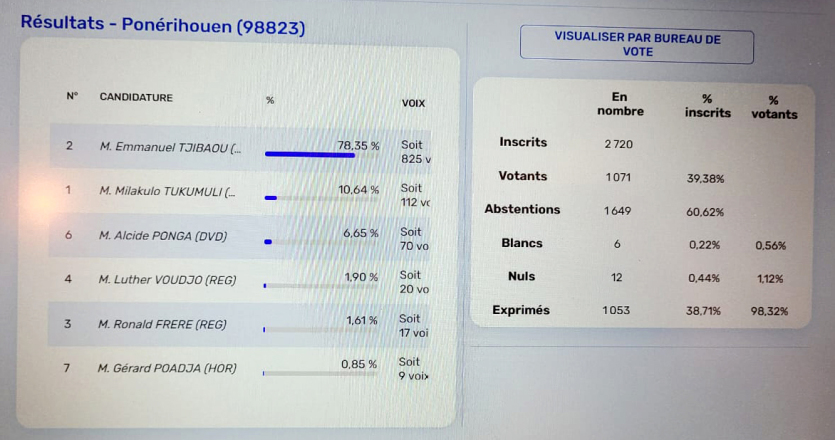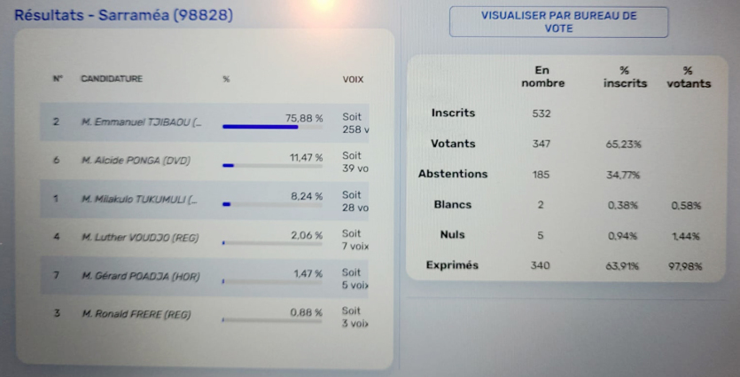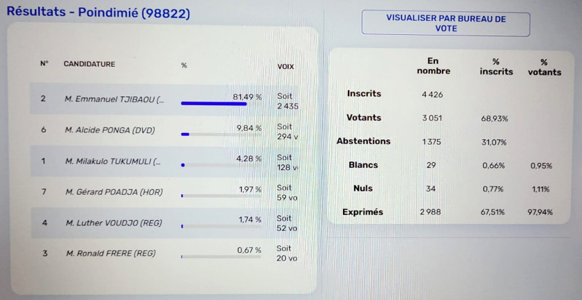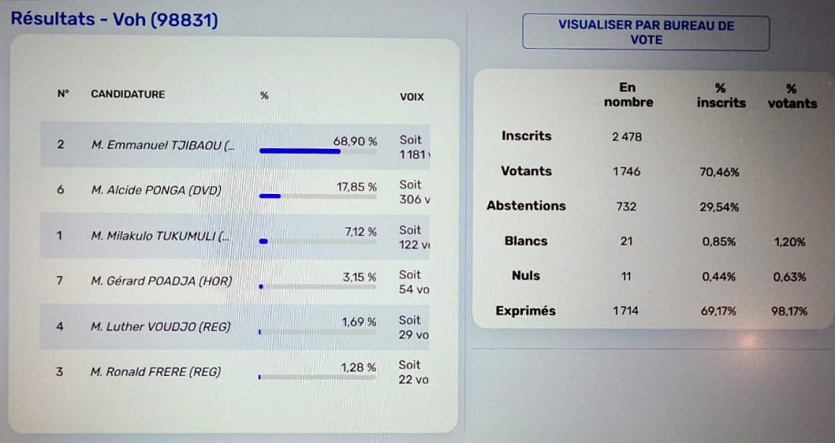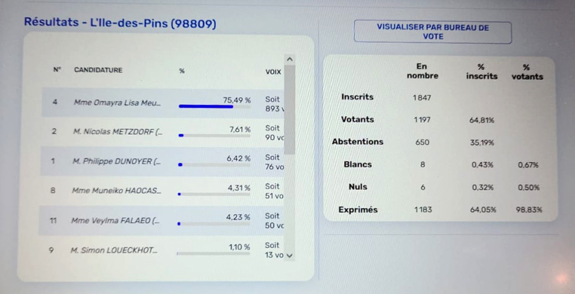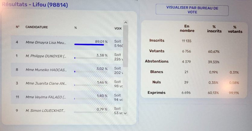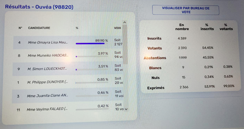 Omayra Naisseline arrive en tête avec 89,01% des voix devant Philippe Dunoyer 3,38 % et Muneiko Haocas 3,02 %. Le taux de participation s'élève à 60,13 %.