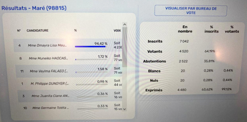 Omayra Naisseline arrive en tête avec 89,90 % des voix devant Muneiko Haocas 3,97 % et Simon Loueckhote 3,51 %. Le taux de participation s'élève à 53,91 %.