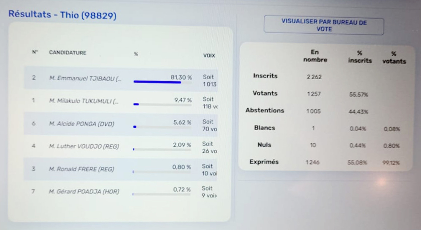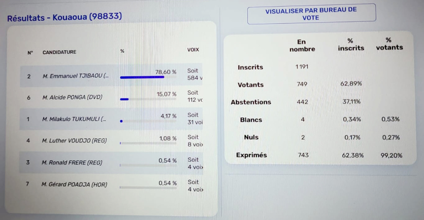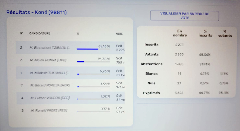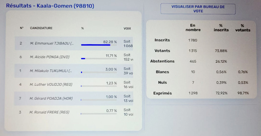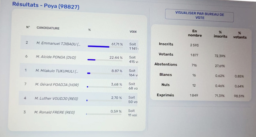Emmanuel Tjibaou arrive en tête avec 88,92 % des voix devant Milakulo Tukumuli 5,21 % et Luther Voudjo 2,33 %. Le taux de participation s'élève à 58,59 %.