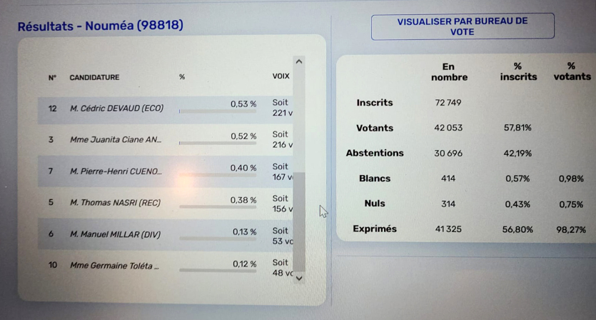 - La rédaction | Crée le 30.06.2024 à 18h46 | Mis à jour le 30.06.2024 à 23h07ImprimerAprès le vote, place aux résultats. Photo Anthony TejeroLe taux de participation lors de ce premier tour des législatives a finalement atteint les 60,02 % sur l’ensemble du Caillou à la fermeture des bureaux à 17 heures, contre 32,51 % en 2022. Suivez l’annonce des résultats commune par commune sur notre site.