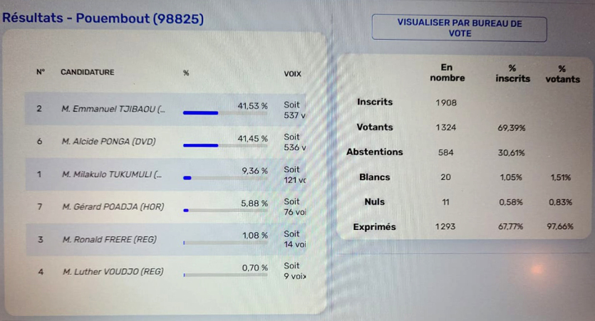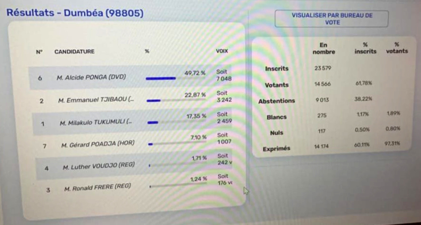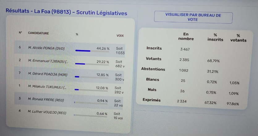 Emmanuel Tjibaou arrive en tête avec 41,53 % des voix devant Alcide Ponga 41,45 et Milakulo Tukumuli 9,36 %. Le taux de participation s'élève à 67,77 %.