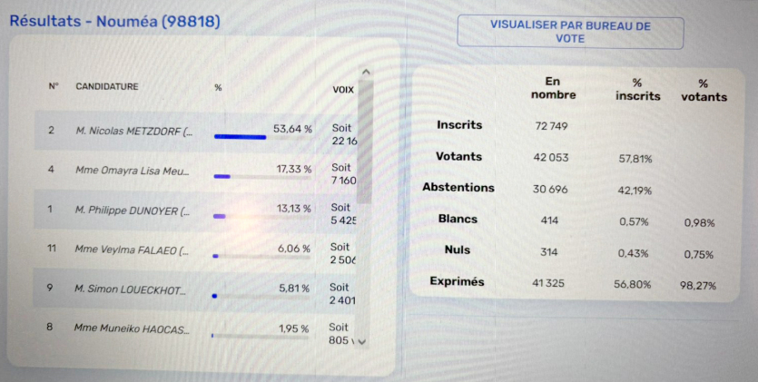 Dans la circonscription regroupant Nouméa, les Loyauté et l'île des Pins, le candidat Loyalistes et Rassemblement Nicolas Metzdorf arrive en tête avec 39,81% des suffrages. Il devance Omayra Naisseline (Indépendantites et nationalistes) 36,34%. Philippe Dunoyer (Calédonie ensemble), le député sortant, complète le podium avec 10,33 % mais ne participera pas au deuxième tour, tout comme Veylma Falaéo (Éveil océanien) 4,87%, Simon Loueckhote (RN) 4 57% ou encore Muneiko Haocas (Mnis) 2,19%. Les scores des autres candidats seront dévoilés demain par le haussariat. Le taux de participation dans la première circonscription s'élève à 58,58 %.