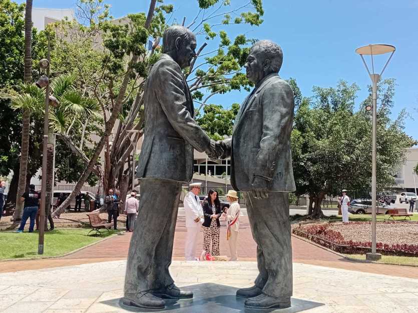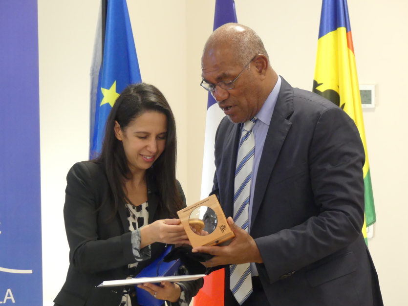 Le président du gouvernement a offert un cadeau à la ministre des Outre-mer, ce lundi 10 novembre. Photo Baptiste Gouret[12 heures] La ministre des Outre-mer a clos sa première matinée en Nouvelle-Calédonie par un passage par la place de la Paix, en présence du haut-commissaire Jacques Billant et de la maire de Nouméa, Sonia Lagarde, où elle a déposé une gerbe de fleurs au pied des statues de Jean-Marie Tjibaou et Jacques Lafleur. Aucune prise de parole de Naïma Moutchou auprès de la presse n'est prévue ce lundi, pour l'heure du moins. Cet après-midi, la ministre rencontrera les chef(fe)s des différentes institutions : Gouvernement, Congrès, province Sud, ville de Nouméa.