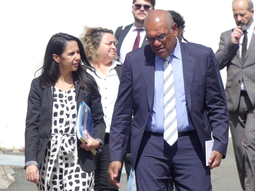 Naïma Moutchou et Alcide Ponga, au terme de leur entretien à la présidence du gouvernement, ce lundi 10 novembre. Photo Baptiste GouretLe président de l'exécutif a indiqué que les discussions ne se sont pas portées sur la question politique, mais essentiellement sur les finances publiques, sujet sur lequel la ministre est très attendue. "Il y a une urgence économique, financière et budgétaire." Naïma Moutchou n'a toutefois rien annoncé quant à l'aide de l'Etat pour la Nouvelle-Calédonie en 2026, alors que le pays devrait être confrontée à une perte de recettes fiscales d'environ 60 milliards par rapport à 2023. "Le projet de loi de finances est débattu en Métropole, je crois que le sujet de la Nouvelle-Calédonie et des outre-mer sera abordé le 18 novembre. Nous, on lui donne des pistes de réflexion. Ensuite, les députés trancheront."