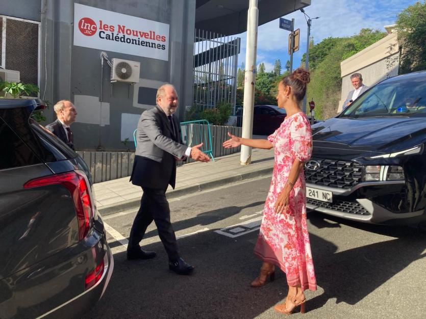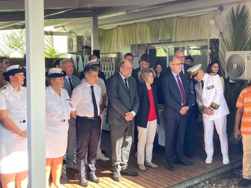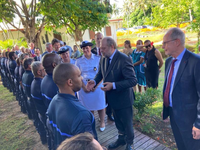 Les trois ministres sont finalement présents pour la coutume. Photo Baptiste Gouret.[8h50] Le ministre de la Justice, Éric Dupond-Moretti est arrivé au Camp-Est. La veille, il a qualifié "d'indignes " les conditions de détention de la prison de Nouméa. Après avoir salué le personnel pénitentiaire, le garde des sceaux doit participer à une cérémonie coutumière.