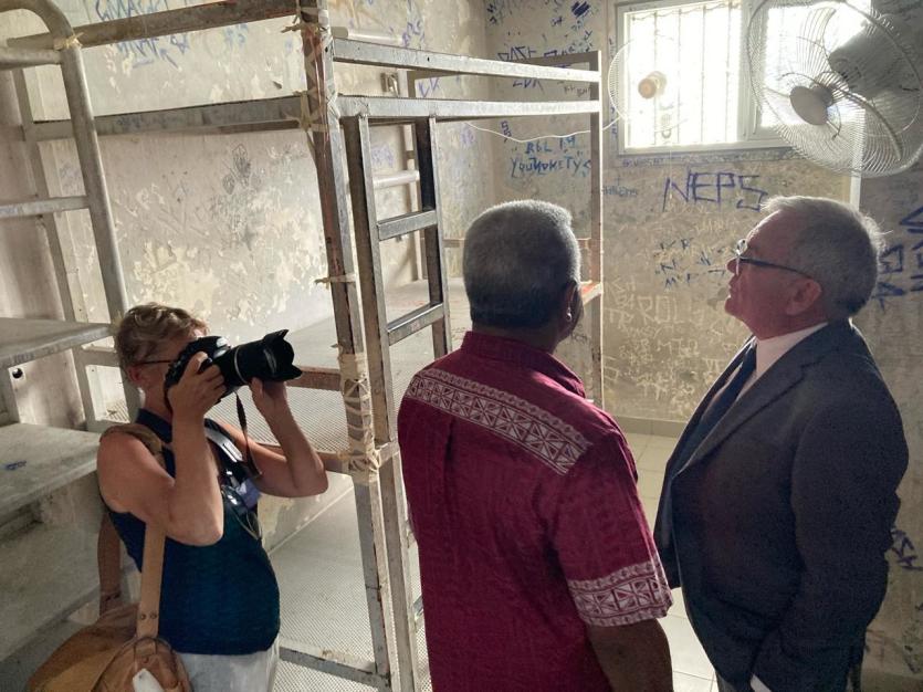Ministres et politiques, ici le président du gouvernement Louis Mapou et le sénateur Georges Naturel, ont pu constater l'état de délabrement des cellules. Photo Baptiste Gouret[9h35] Tahitiens, Wallisiens, Mélanésiens, Indonésiens, Vietnamiens, caldoches… Toutes les communautés représentées au sein du personnel pénitentiaire ont offert des présents traditionnels aux ministres.