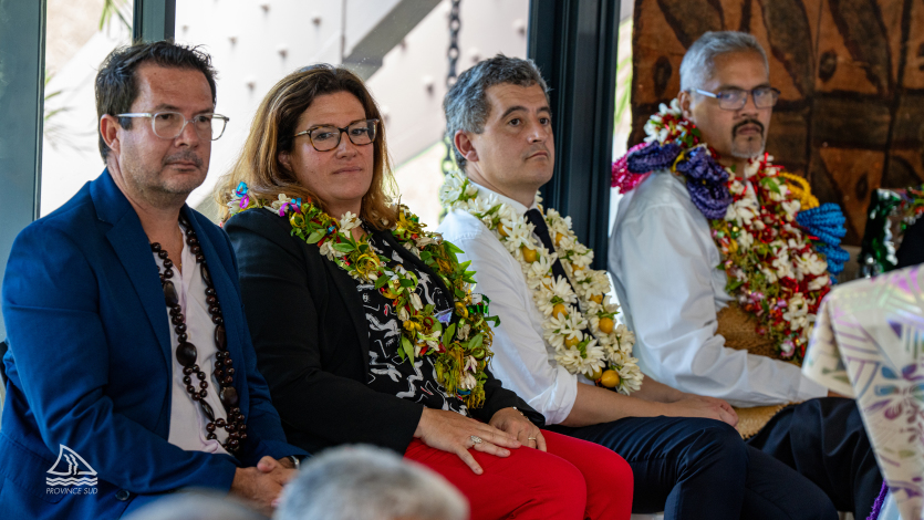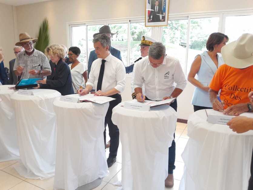 La convention a été signée dans la mairie de Moindou. Photo Anthony Tejero[15h20] "Cette présence de nouvelle brigade de gendarmerie permettra, j'espère, à protéger vos biens", a déclaré Darmanin face aux éleveurs au sujet de la convention et de la nouvelle brigade.
