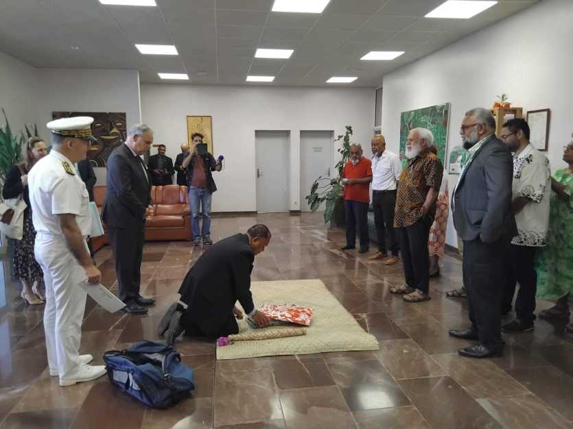 [10h20] Une coutume d'un bonjour "particulier" et "hautement symbolique" du ministre, dont c'est le troisième déplacement en Nouvelle-Calédonie, se déroule auprès du chef de la province Nord, Paul Néaoutyine, et le député Emmanuel Tjibaou.
