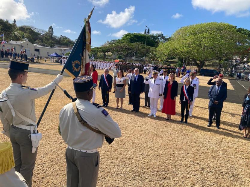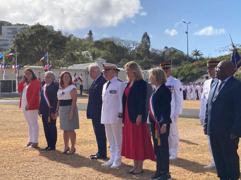 Le haussaire Louis Le Franc, entouré de la présidente de l'Assemblée nation Yaël Braun-Pivet, du président du Sénat Gérard Larcher, de la présidente de la province Sud Sonia Backès et de la maire de Nouméa Sonia Lagarde assistent à la cérémonie de l'Armistice du novembre place Bir-Hakeim à Nouméa. Photo Baptiste Gouret" Nous venons de partager la mémoire du 11 novembre, et quelque part dans le chemin de coutume, c'est le souvenir de nos anciens, de ce qu'ils nous transmettent et dont nous devons être aujourd'hui l'expression ", a souligné Gerard Larcher.