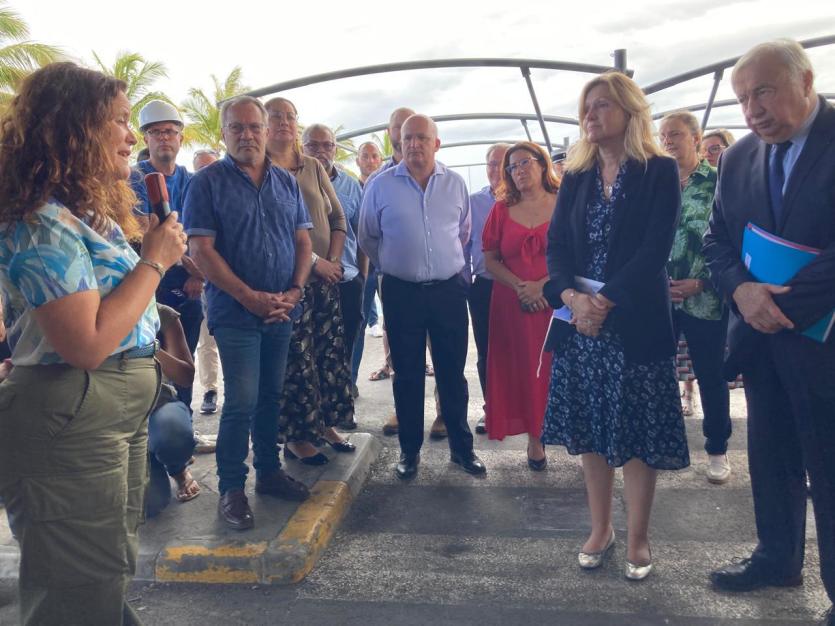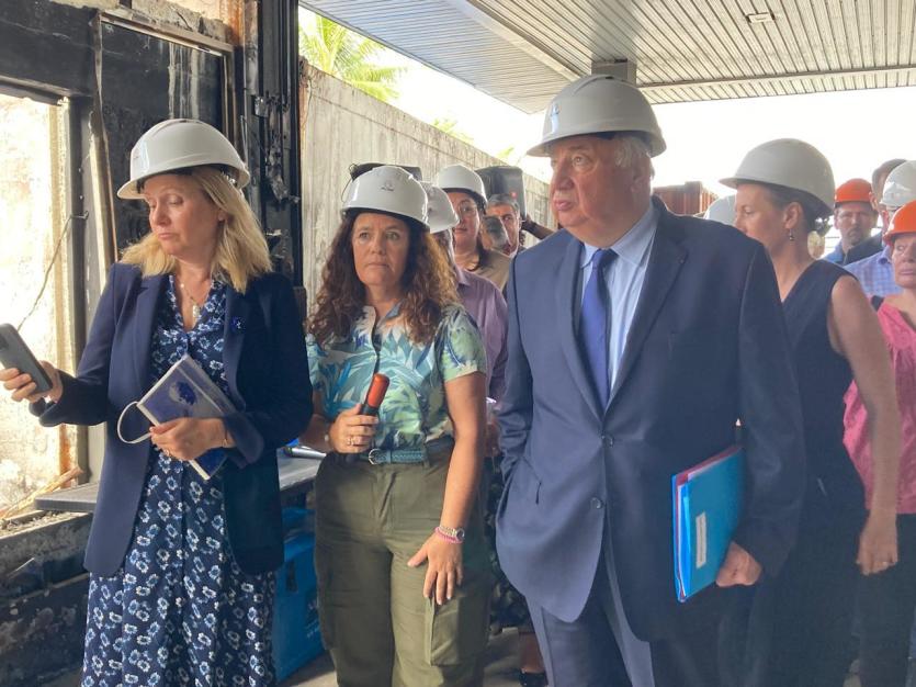 Yaël Braun-Pivet et Gérard Larcher ont écouté les représentants de NC Eco au pied de l’hypermarché Carrefour Kenu-In incendié aux premiers jours des violences. Photo Baptiste Gouret[8h15] La visite du centre Kenu-In, pillé puis incendié, a commencé. 34 000 mètres carrés ont été brûlés en l’espace de 15 jours. 400 salariés du centre commercial sont toujours en chômage partiel, en attendant la reconstruction. La prolongation de ce dispositif est justement un des sujets que les représentants de NC Eco veulent aborder avec les parlementaires.