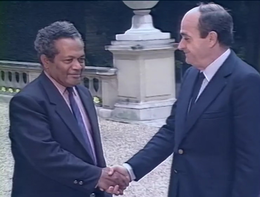 La première poignée de main historique entre Jacques Lafleur et Jean-Marie Tjibaou, le 26 juin 1988. Photo INAToutes les communautés sont sous le choc et prennent conscience de la nécessité de dialoguer. Survient alors un tournant majeur dans la carrière de Jacques Lafleur. Contre toute attente, il participe aux négociations des Accords de Matignon en juin 1988 avec Jean-Marie Tjibaou, leader des indépendantistes kanak, et le Premier ministre socialiste d’alors Michel Rocard. Ces accords visent à apaiser les tensions violentes qui taraudent le Caillou depuis les années 1980. Jacques Lafleur accepte un compromis historique et reconnaît la nécessité d’un rééquilibrage économique et social entre Kanak et Caldoches (les descendants d’Européens), contre les conservatismes de son propre camp.
