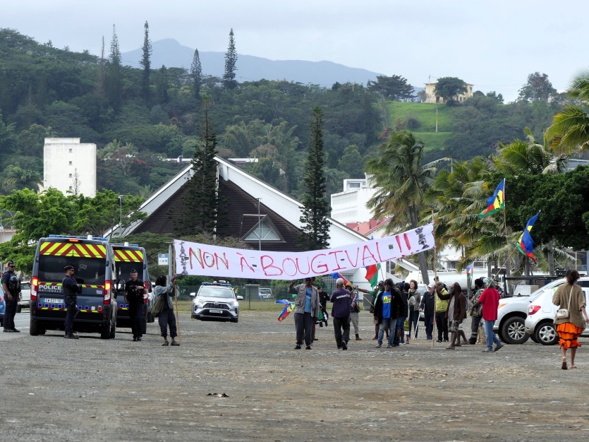 À l’entrée de Nouville, une dizaine de militants indépendantistes ont exprimé leur refus de l’accord de Bougival. Photo Baptiste GouretParmi elles, le Sénat coutumier, où le ministre était attendu pour entamer sa visite, ce mercredi. Son président n’a d’ailleurs pas manqué de le rappeler. "Nous avons constaté en l’étudiant que le projet d’accord est totalement déséquilibré", a fait remarquer Mahe Gowe au ministre, évoquant la "ligne de fracture" que le document aurait provoquée entre deux camps.