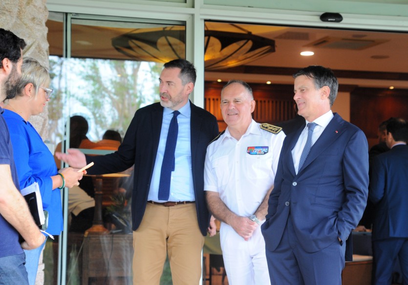Éric Thiers, de la Mission Nouvelle-Calédonie, rattaché au Premier ministre, Louis Le Franc, haut-commissaire, et Manuel Valls, ministre des Outre-mer, lors de l’arrivée des différentes délégations, mercredi matin. Photo A.-C.P.MERCI DE VOUS IDENTIFIER