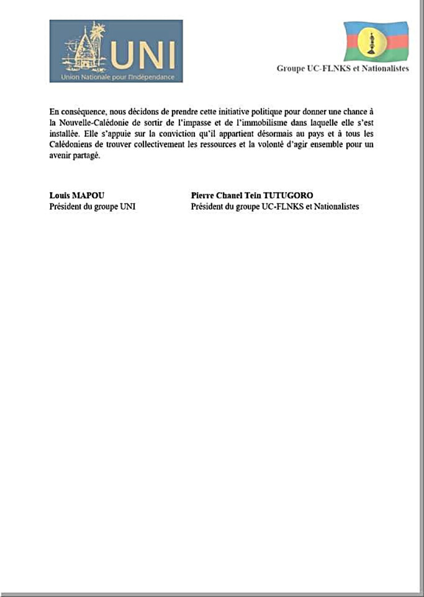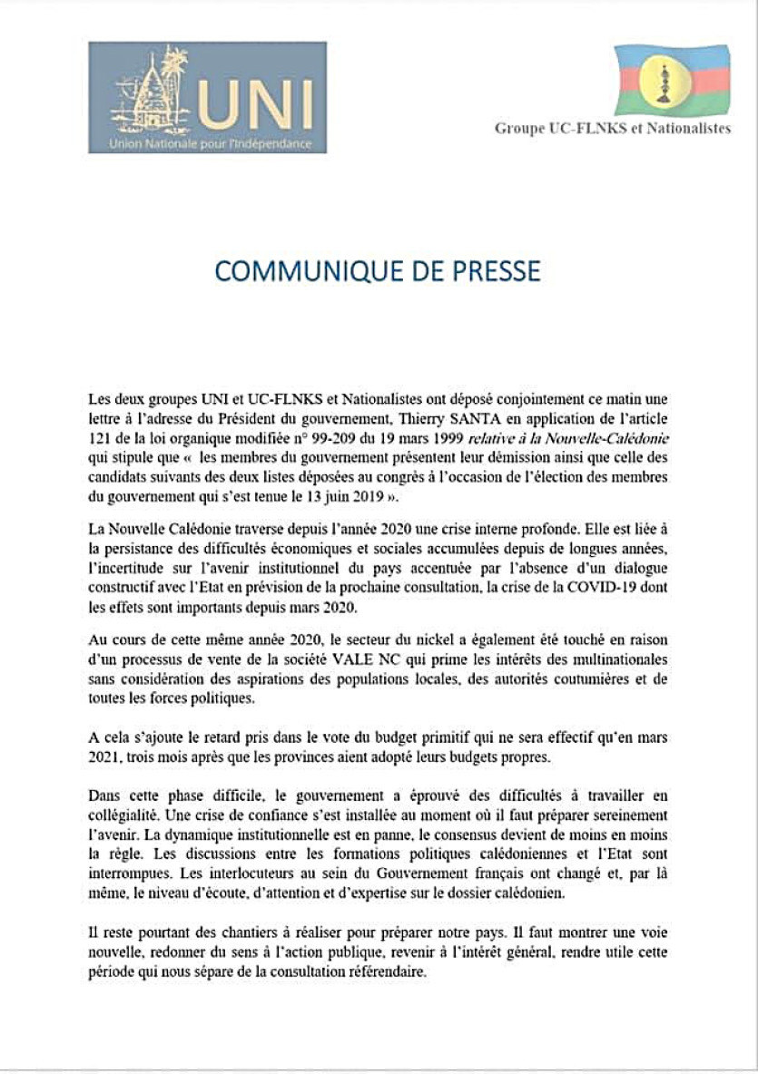 Communiqué de presse UNI, groupe UC-FLNKS et nationalistes Photo DRMERCI DE VOUS IDENTIFIER