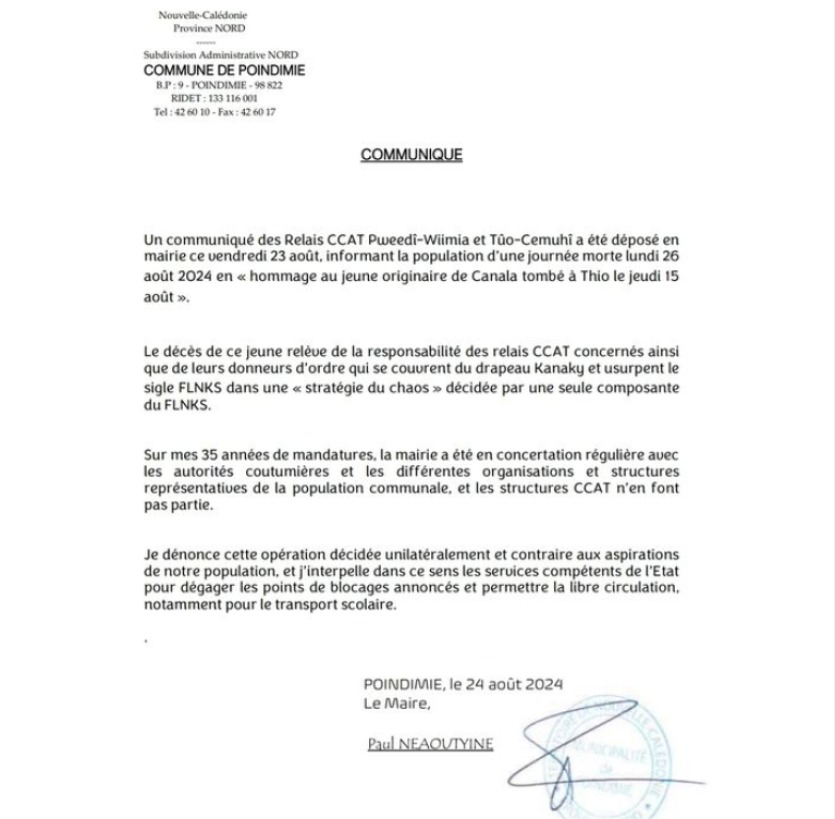 Le second communiqué publié par le maire de Poindimié est nettement mois clément. Tout d'abord, il rappelle que les relais CCAT Pweedi-Wiimia et Túo-Cemuhi ont déposé vendredi en mairie un document informant la population d'une journée morte lundi 26 août 2024 en " hommage au jeune originaire de Canala tombé à Thio le jeudi 15 août ".