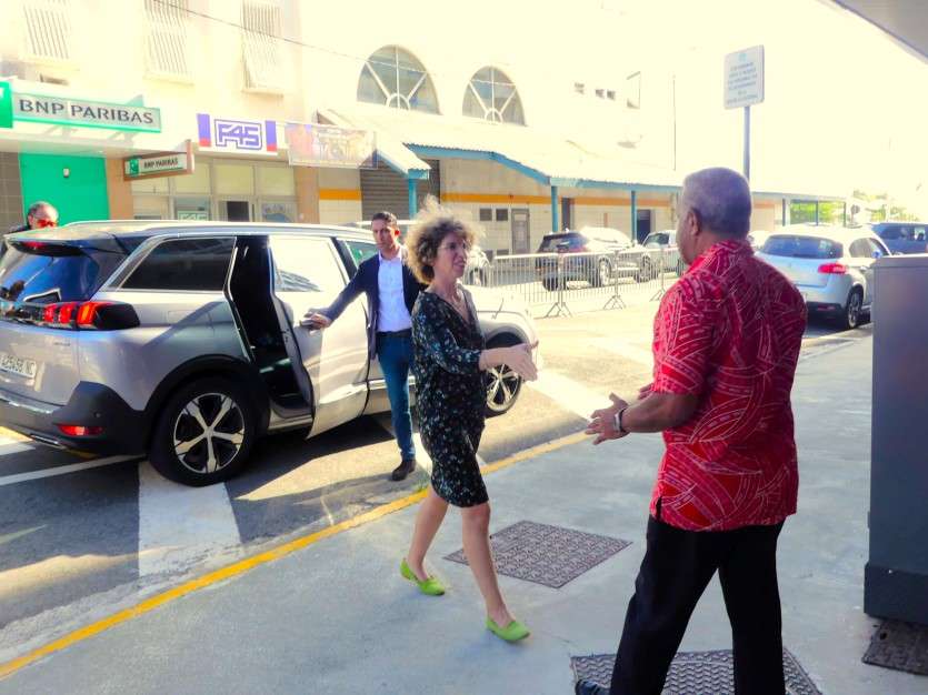 - Baptiste Gouret | Crée le 23.02.2024 à 16h41 | Mis à jour le 23.02.2024 à 16h42ImprimerLe président du gouvernement Louis Mapou a accueilli la ministre déléguée aux Outre-Mer, ce vendredi en fin de journée au siège du gouvernement. Photo Baptiste GouretAlors que Gérald Darmanin a déjà rejoint l’Australie, la ministre déléguée aux Outre-mer poursuit sa visite sur le Caillou, ce vendredi. Après un passage en Brousse, elle achève son déplacement par des rencontres avec Louis Mapou, Sonia Lagarde et Roch Wamytan.
