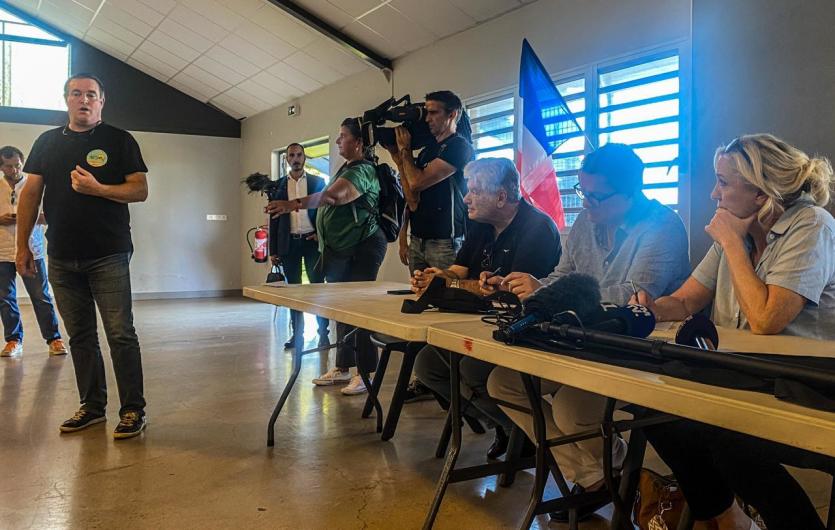 Cet habitant est venu avec son drapeau kanak "saluer Marine Le Pen et son discours de paix". Malgré quelques tensions, il a pu serrer la main de la députée. Photo Julien MazzoniDans la Salle des communautés, les 150 personnes présentes font face à la délégation du Rassemblement national et ils ont des choses à leur dire. Florent Perrin introduit la rencontre en évoquant d'abord "la nécessaire unité du camp loyaliste. On a confiance en nos élus qui ont dit non au projet d'indépendance de [Manuel] Valls. Il faut être ensemble pour que la Nouvelle-Calédonie reste française." La salle applaudit. Le président poursuit sur les thèmes qui préoccupent les membres de son association : le respect de la démocratie et la sécurisation de la route de Saint-Louis. "On veut la construction d'un pont pour contourner la tribu, c'est la seule solution pour arrêter d'être pris en otage, on demande votre soutien à l'Assemblée nationale", clame-t-il en direction de Marine Le Pen.