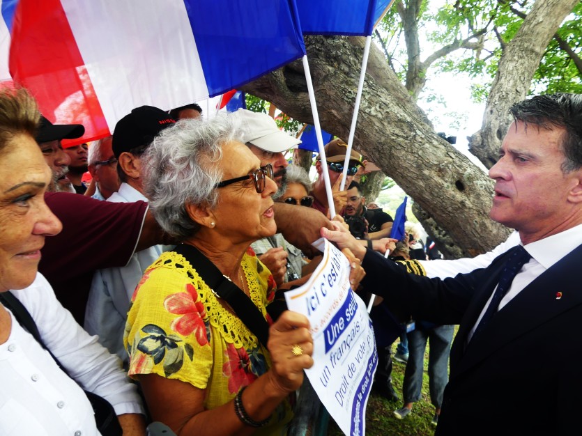 Le ministre des Outre-mer a été chahuté par des partisans d’un maintien de la Nouvelle-Calédonie dans la France, samedi 22 février. Photo Anthony TejeroC’est par une foule de militants non-indépendantistes très remontés que le ministre des Outre-mer, Manuel Valls, est accueilli, samedi 22 février, en marge de sa première séquence organisée à la Croix de Lorraine, à Nouméa. Chauffées à blanc par leurs leaders lors d’une réunion publique qui avait rassemblé plus de 2 000 personnes à l’Anse-Vata, des centaines de partisans d’un maintien de la Nouvelle-Calédonie dans la France interpellent le ministre, drapeaux tricolores en mains. La mobilisation se veut une réaction aux propos du locataire de la rue Oudinot, tenus quelques jours avant sa venue dans les colonnes du Monde, concernant la trajectoire de l’accord de Nouméa qui irait, selon lui, "d’une souveraineté partagée à une souveraineté pleine et entière". "Je suis venu dire que la France est toujours là. Et que le lien avec la Calédonie est fort", tente de rassurer le ministre.