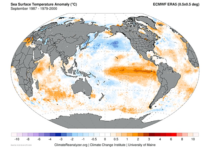 En temps normal El Niño (ici en septembre 1987) génère de l’eau chaude et des pluies à l’est du Pacifique et de l’eau plus fraîche et un temps sec, à l’ouest. Source : Climate Change Institute | University of Maine.Situation inhabituelle d’El Niño cette année