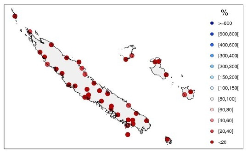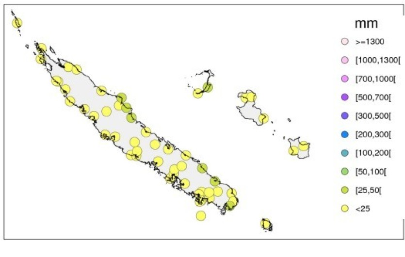 La grande majorité des stations météo du pays ont reçu moins de 20 % des pluies normalement attendues en novembre. Source Météo France NCEt le début du mois de décembre est même "pire". Seules quatre stations affichent plus de 3 mm de pluie au compteur (jusqu’au 11 décembre inclus) à Houaïlou (la plus arrosée avec 7mm), Hienghène, Touho et Pouébo.