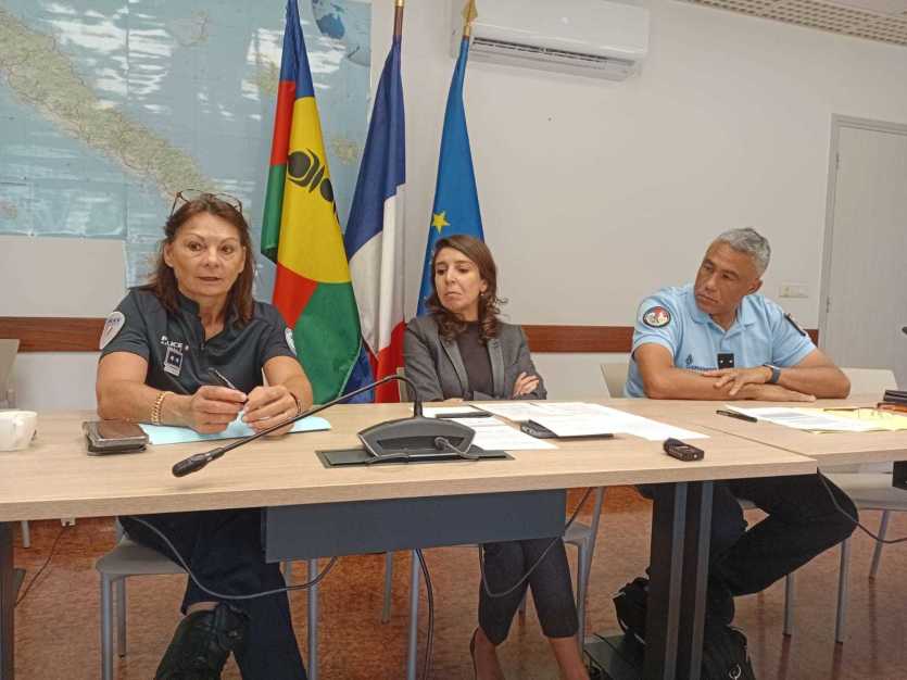 Marjorie Ghizoli, directrice territoriale de la police nationale, Anaïs Aït Mansour, la directrice de cabinet du haussaire et François Haouchine, commandant de la gendarmerie en Nouvelle-Calédonie, ont présenté à la presse, ce vendredi 19 septembre, le dispositif de sécurité prévu jusqu’à la fin du mois.Interdiction préventive de vente d’alcool, annonce d’un dispositif accru de sécurité… Voilà qui a de quoi provoquer un climat anxiogène auprès de certains Calédoniens. Pour autant, les autorités tiennent à nuancer la situation dans le pays : "L’objectif n’est pas d’angoisser les gens mais bien de les rassurer en leur montrant qu’au contraire, on s’organise, on s’adapte et on fait notre travail du mieux qu’on le peut pour être visibles et présents", précise Marjorie Ghizoli.