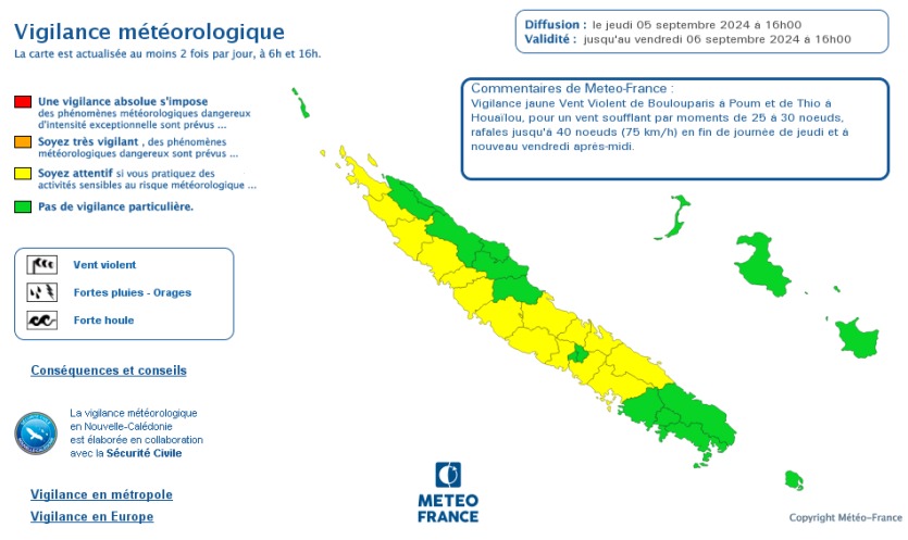 Sur la côte Ouest, elle s’étend de Poum à Boulouparis, tandis que Houaïlou, Kouaoua, Canala et Thio sont concernées sur la côte Est. Un vent soufflant par moments de 25 à 30 nœuds est prévu. Des rafales jusqu’à 40 nœuds, soit 75 km/h pourraient également avoir lieu vendredi après-midi.