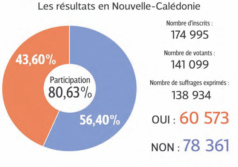 La Calédonie a parlé et parlé fort. Jamais consultation ou élection n’avait attiré autant de monde dans les isoloirs. Avec un taux de participation de 80,63 %, personne ne peut contester le résultat. Et celui-ci est sans appel : 56,4 % des votants ont refusé de voir la Nouvelle-Calédonie accéder à la pleine souveraineté. Un non ferme, mais pas totalement frustrant pour les indépendantistes qui ont réussi un score très au-dessus de celui annoncé par les différents sondages. La campagne du FLNKS semble avoir payé avec, par exemple, des résultats qui ont assez nettement dépassé ceux réalisés lors des dernières provinciales dans le Grand Nouméa.