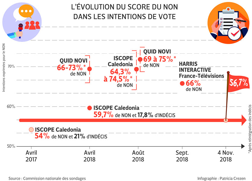- La campagne du référendum a été rythmée par des sondages donnant au « non » une très nette avance dans les intentions de vote. Bien plus nette que dans les scores de dimanche dernier. De quoi peser sur la mobilisation ? Beaucoup le pensent. Les sondeurs, eux, tentent de mesurer et d’expliquer les écarts observés.Le « oui à la peine » et « le Non très loin devant», «l’enterrement», voire même « l’immolation » du projet indépendantiste… Ces prédictions d’élus ou de quidams, dans les médias ou sur les réseaux sociaux, ont rythmé la campagne référendaireIl vous reste 97% de l'article à découvrir.Cet article est réservé aux abonnés.