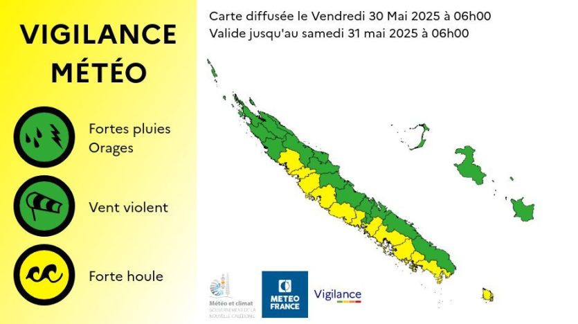 Un temps ensoleillé et pas de vent. Les conditions semblent idéales pour partir en mer ce vendredi 30 mai. Sauf que Météo France met en garde les usagers, un avis de forte houle est lancé dans treize communes : sur la côte Ouest de la Grande Terre (De Voh au Mont-Dore) et sur l'île des Pins, avec des creux attendus entre 3 et 3,5 mètres. Une vigilance jaune qui est maintenue pour la nuit. Prudence.